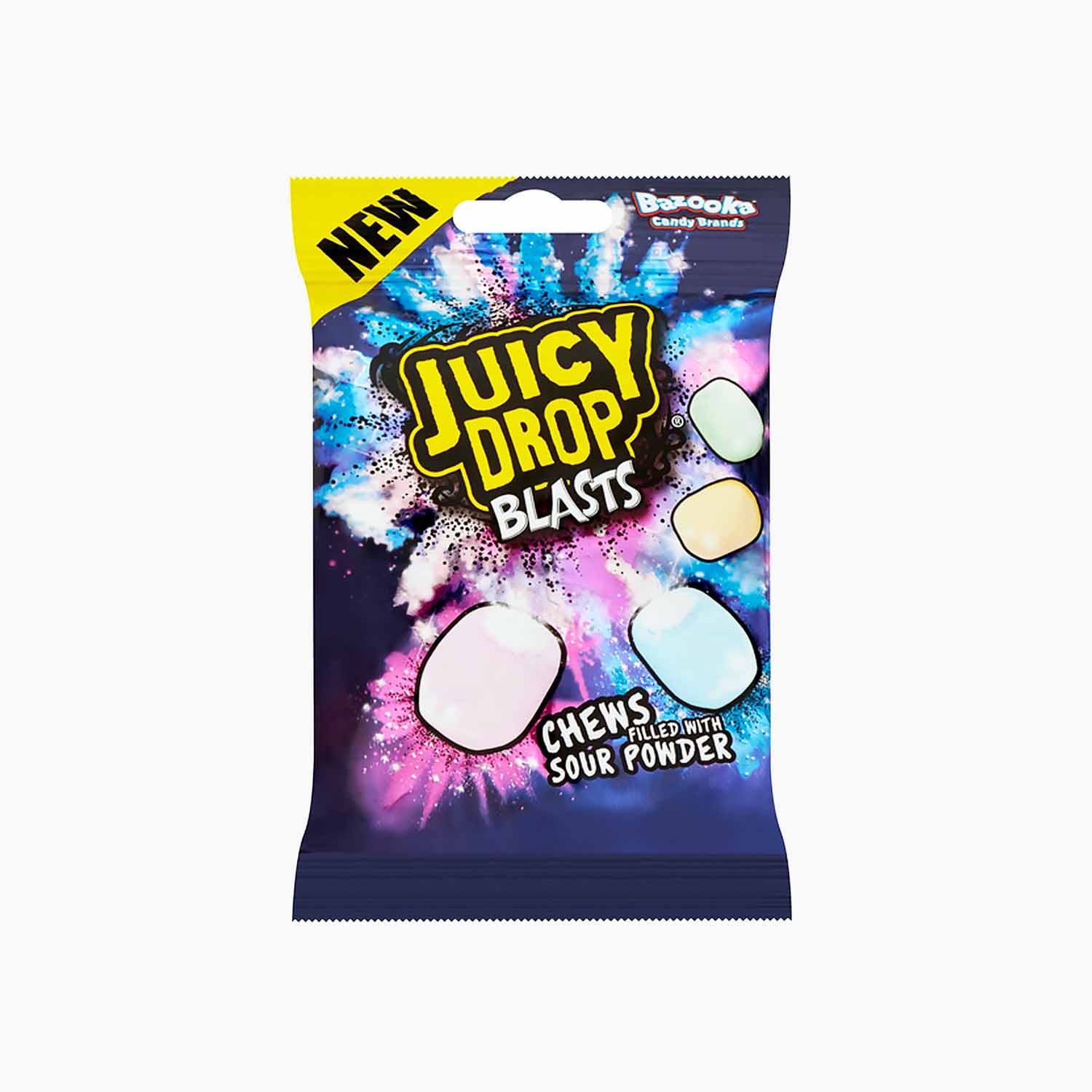Die Juicy Drop Blasts sind weiche, fruchtige Kaubonbons, die mit saurem Brausepulver gefüllt sind.